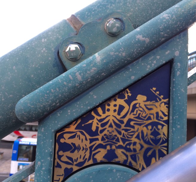 I love looking at the sidewalks in Japan. Even the grate covers are beautiful. Each different town has its own manhole covers–